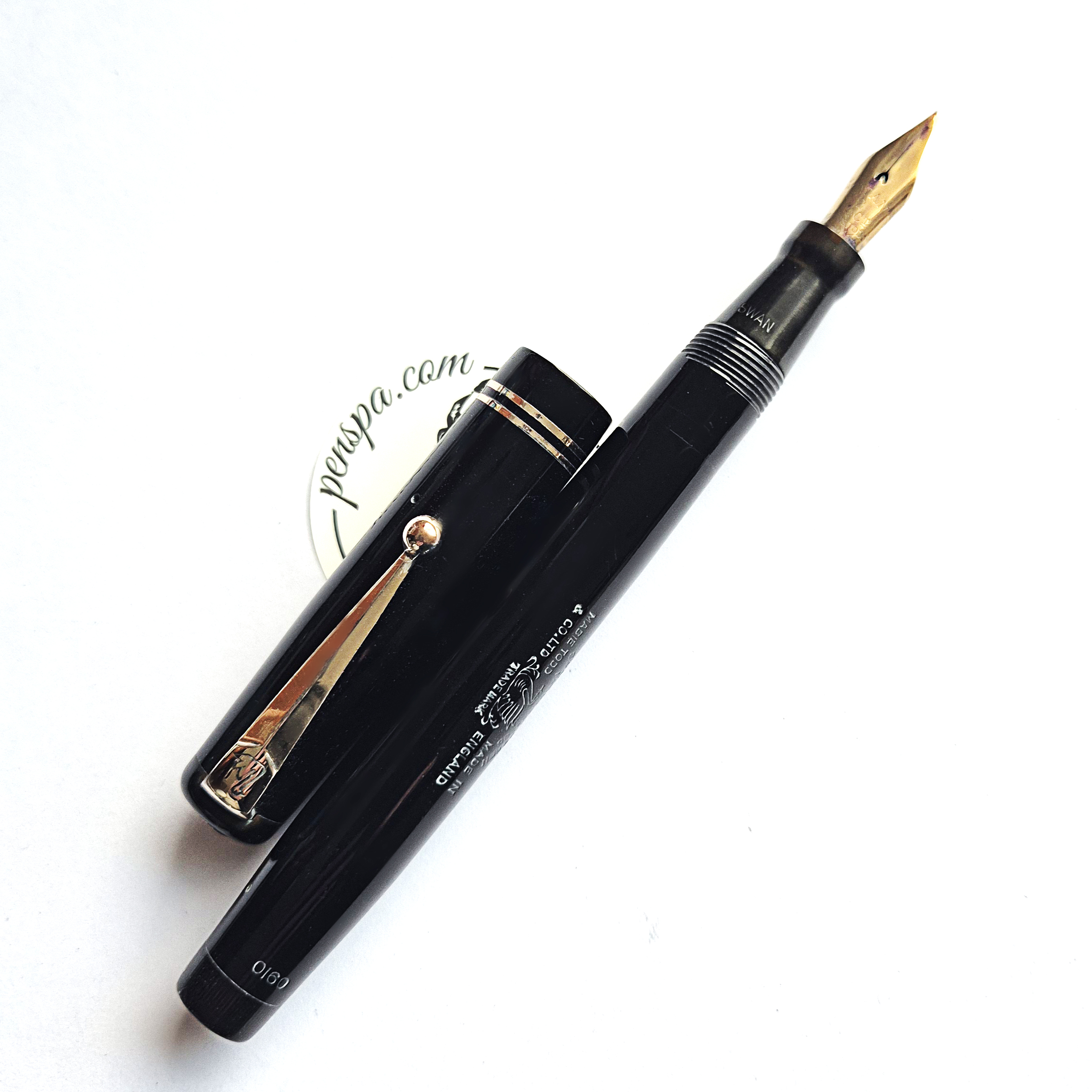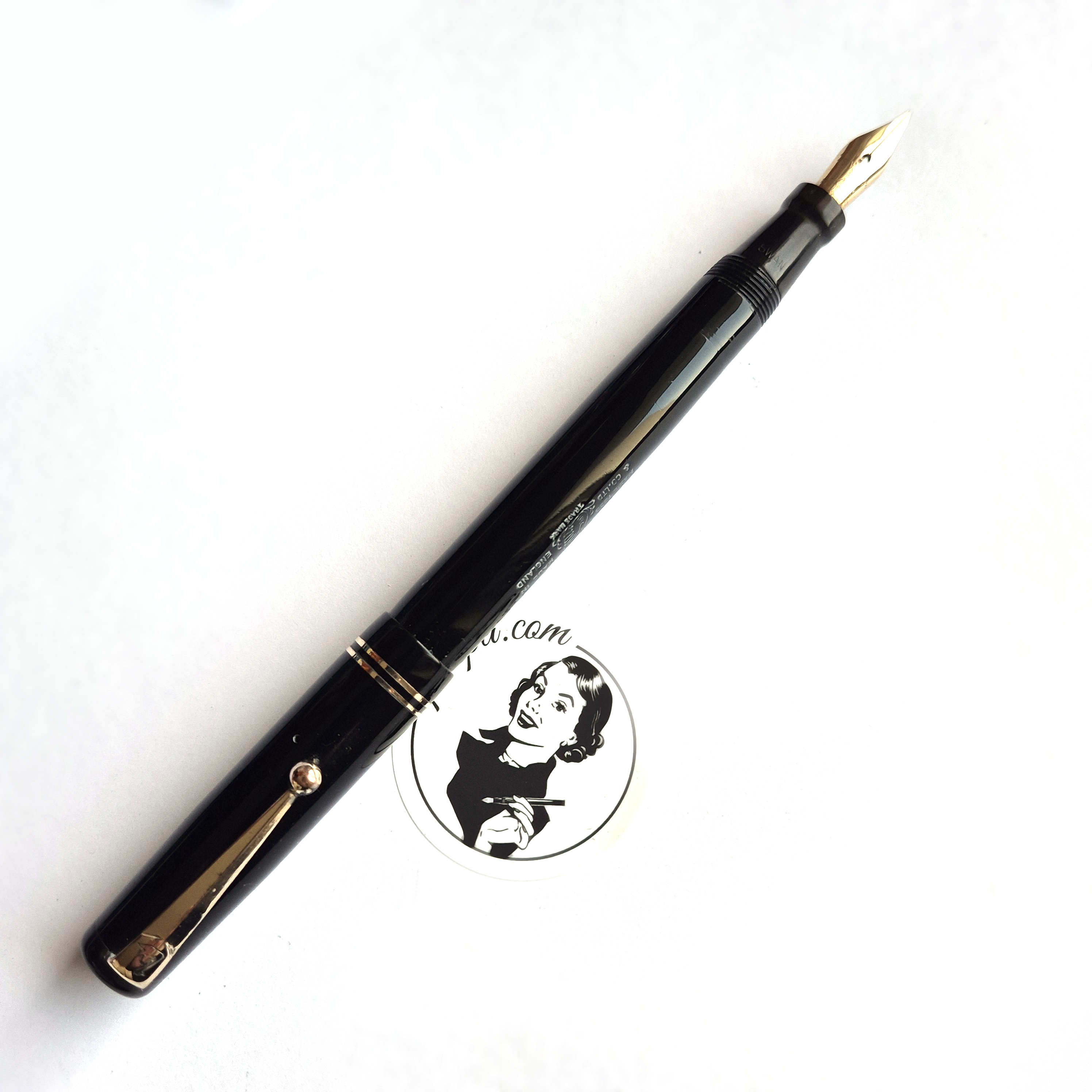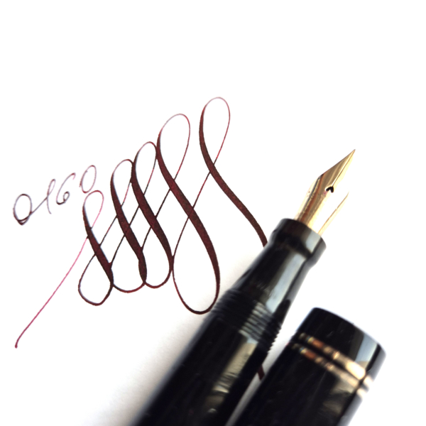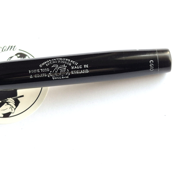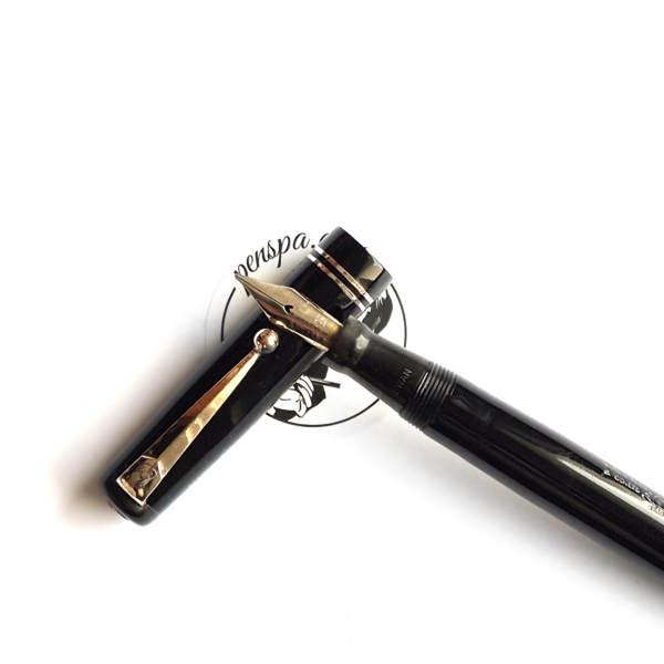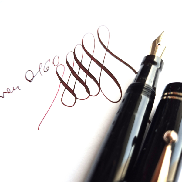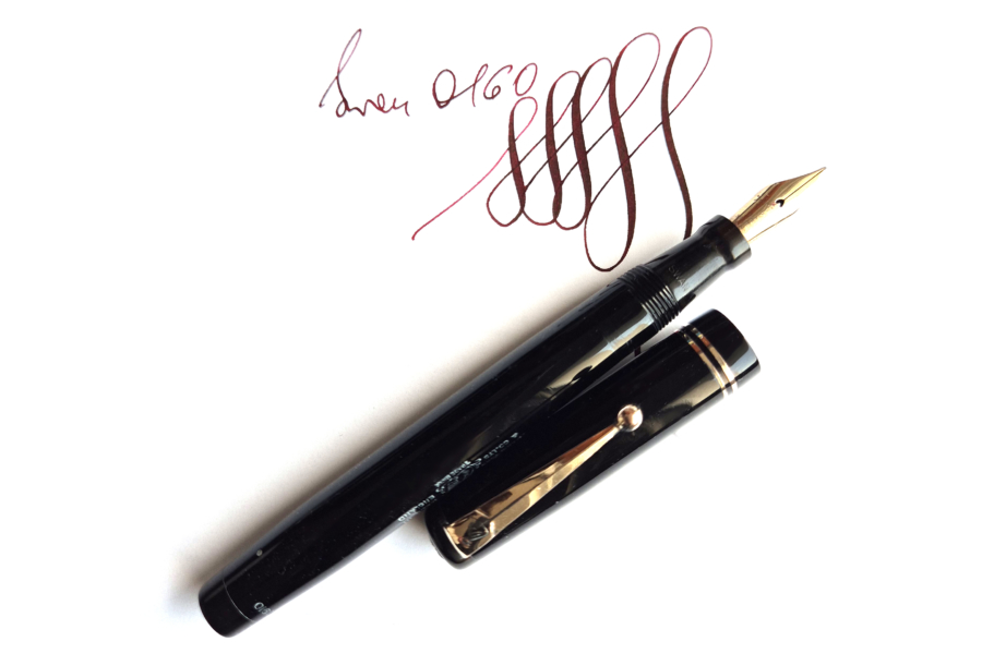For sale is an elegant Swan pen, 0160. Made in England in the late 1930’s. Made of celluloid, twist filler. Very good condition with no dents, chips or deeper scratches, very good plating and imprints. Very nice Swan nr 2 14ct nib, fully flexible, f-1,7mm. It’s not the softest flex, but it snaps very quickly back. ‘