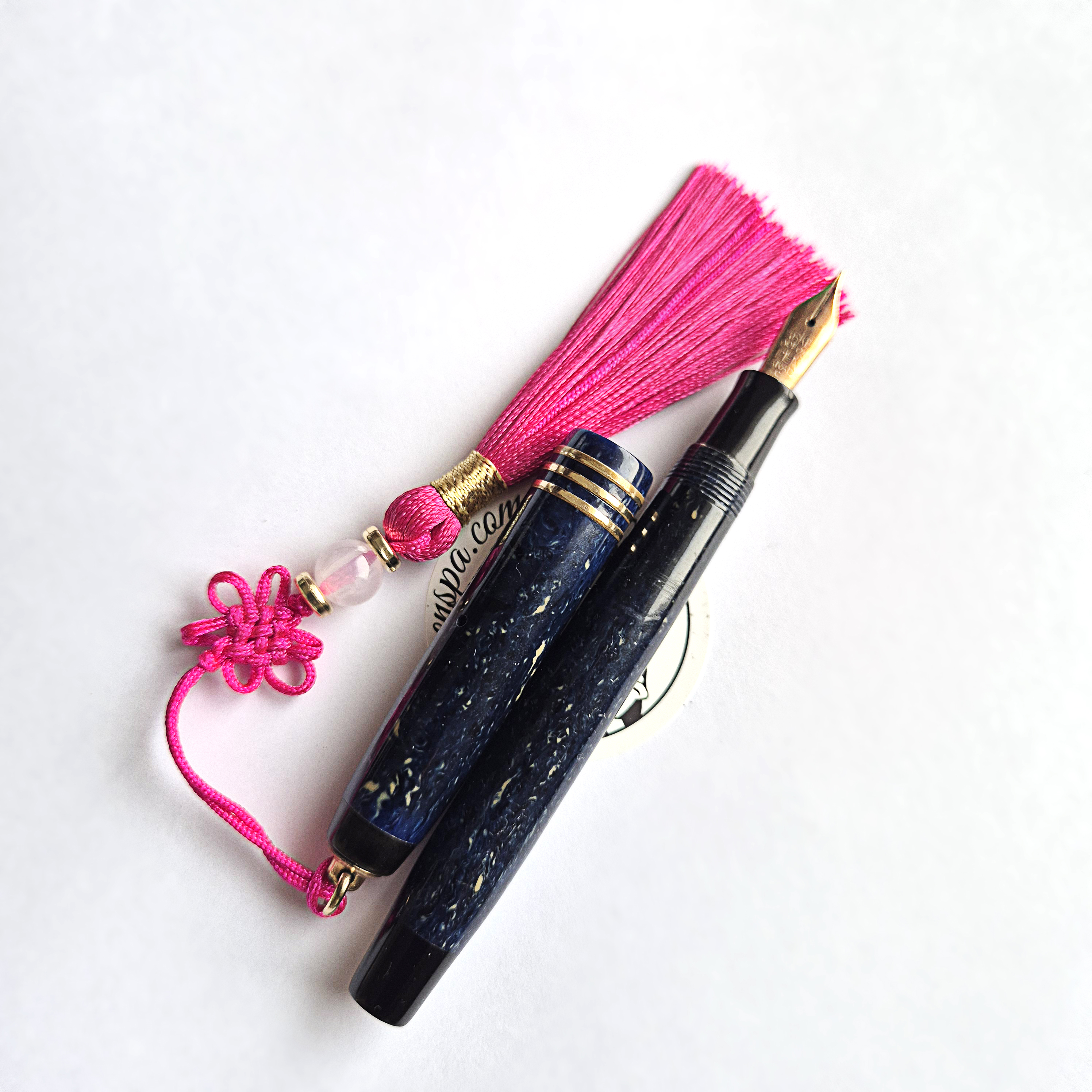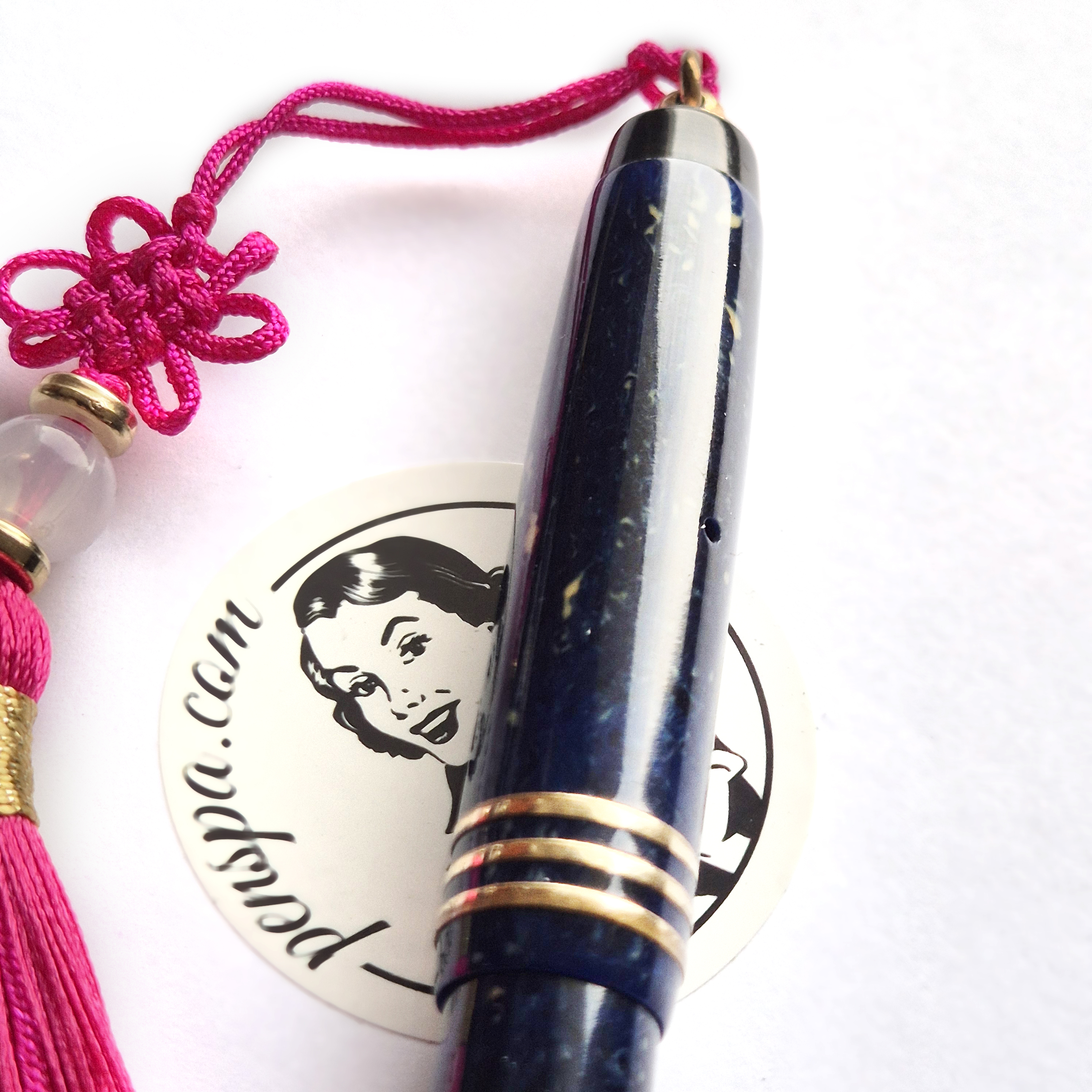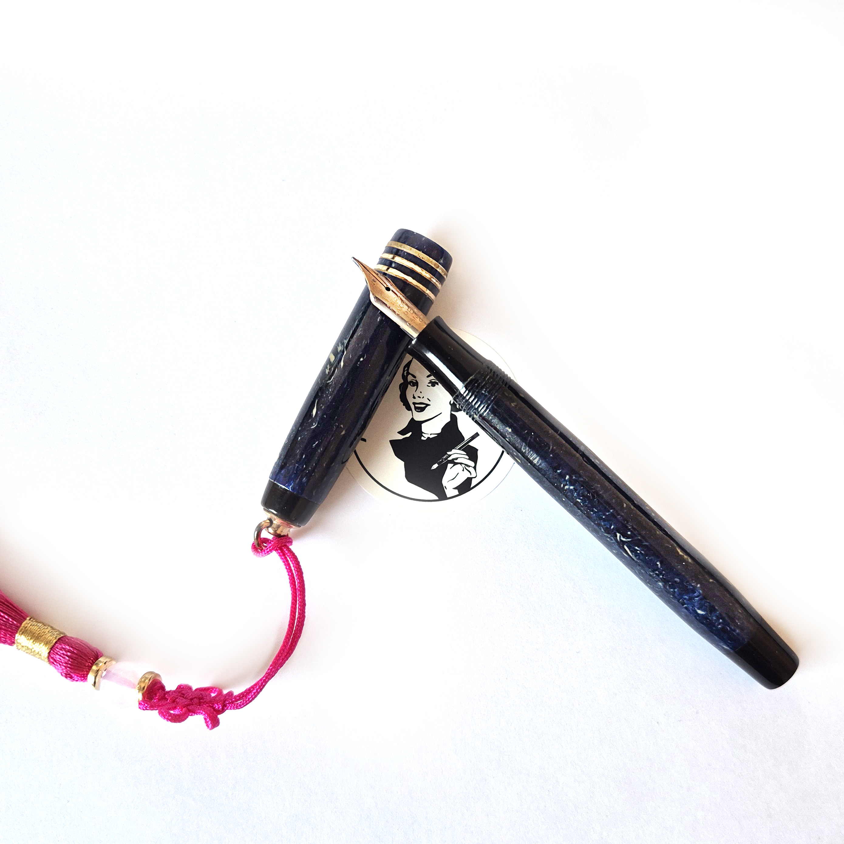 For sale is Parker Duofold Streamline pen, ringtop, button filler. Made in Canada, 1930’s. Beautiful lapis blue celluloid. The pen has no cracks or deeper scratches, there is some plating loss on the rings. The pen has a very nicely writing nib, grade F, 14ct.