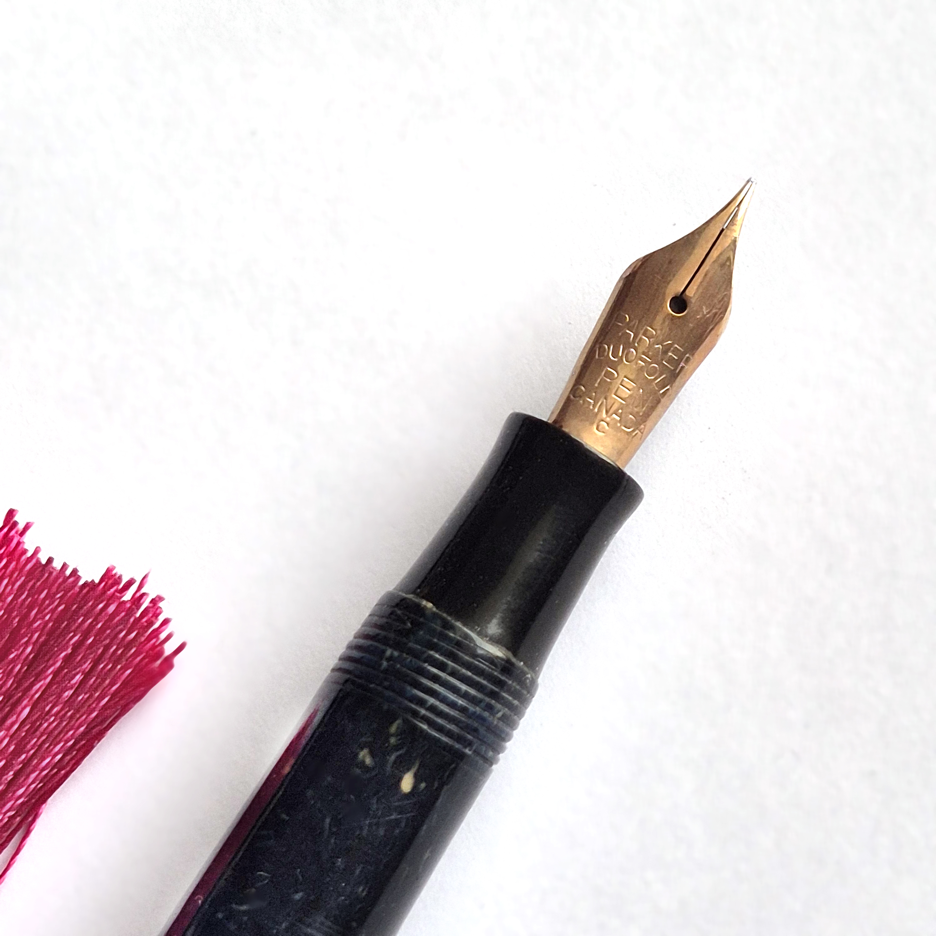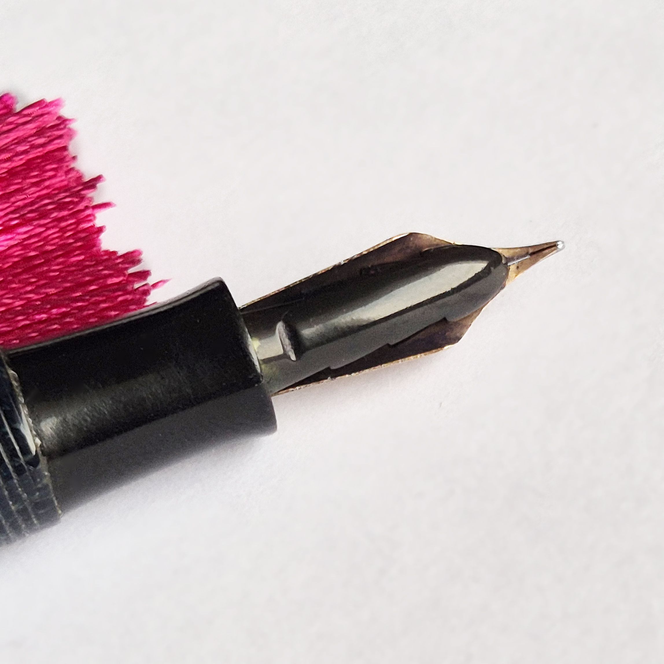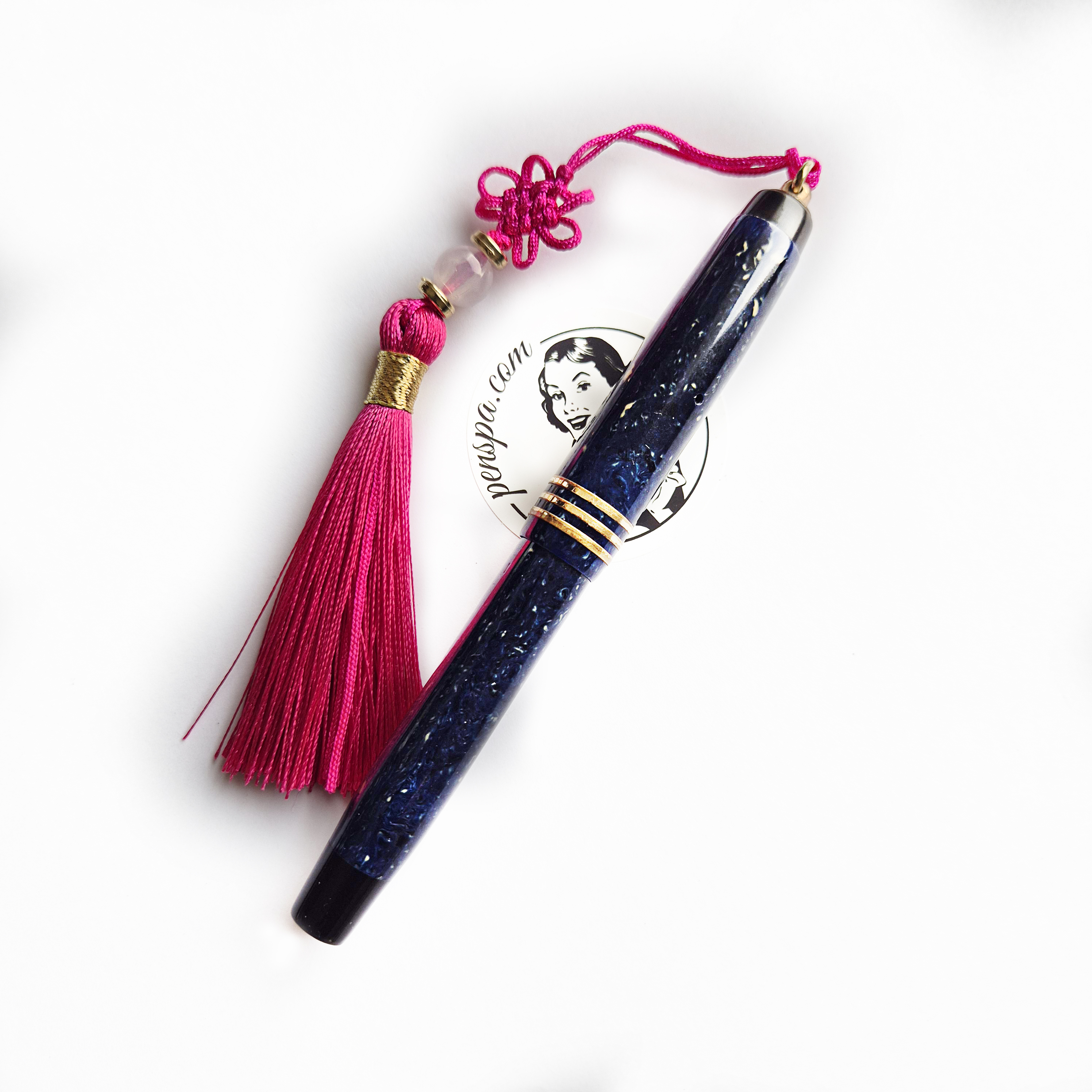 For sale is Parker Duofold Streamline pen, ringtop, button filler. Made in Canada, 1930’s. Beautiful lapis blue celluloid. The pen has no cracks or deeper scratches, there is some plating loss on the rings. The pen has a very nicely writing nib, grade F, 14ct.
