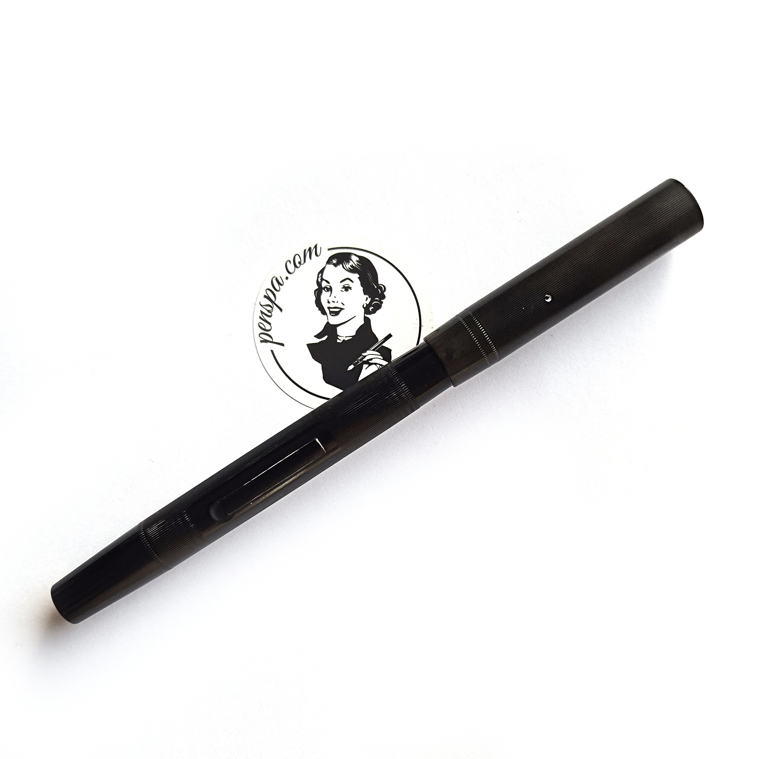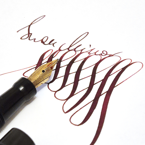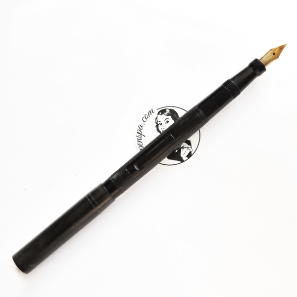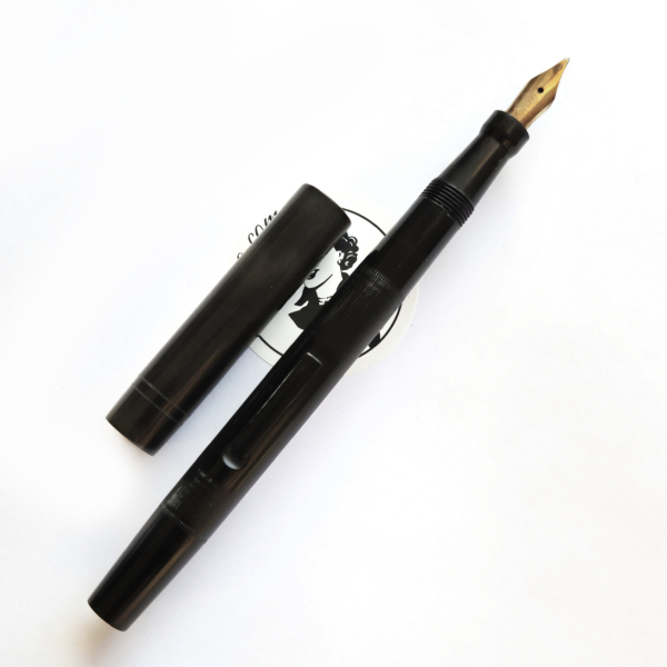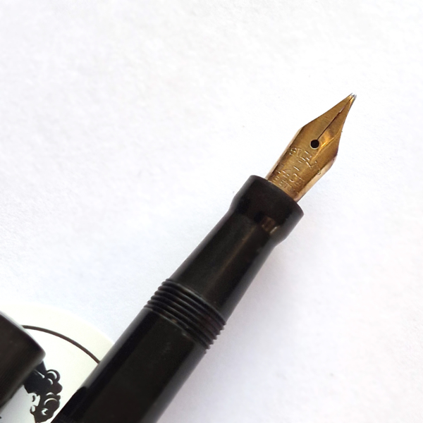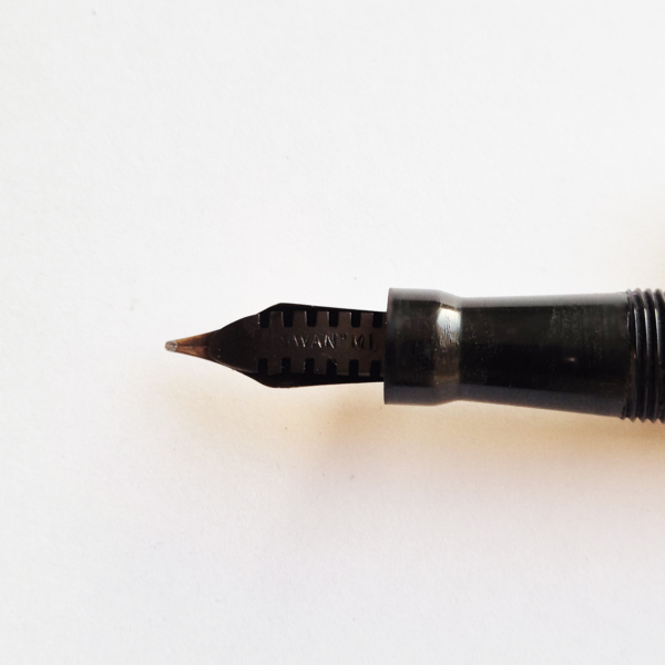 For sale is Swan Minor pen, made in England in the 1920/30’s, made of ebonite and with an ebonite lever. The pen has no cracks or deeper scratches, very good color, perfect imprints. What makes it exceptional is the nib, smooth and with quite a soft flex going from f to 1,7mm. The pen is 13.2cm long when closed.