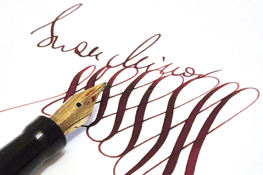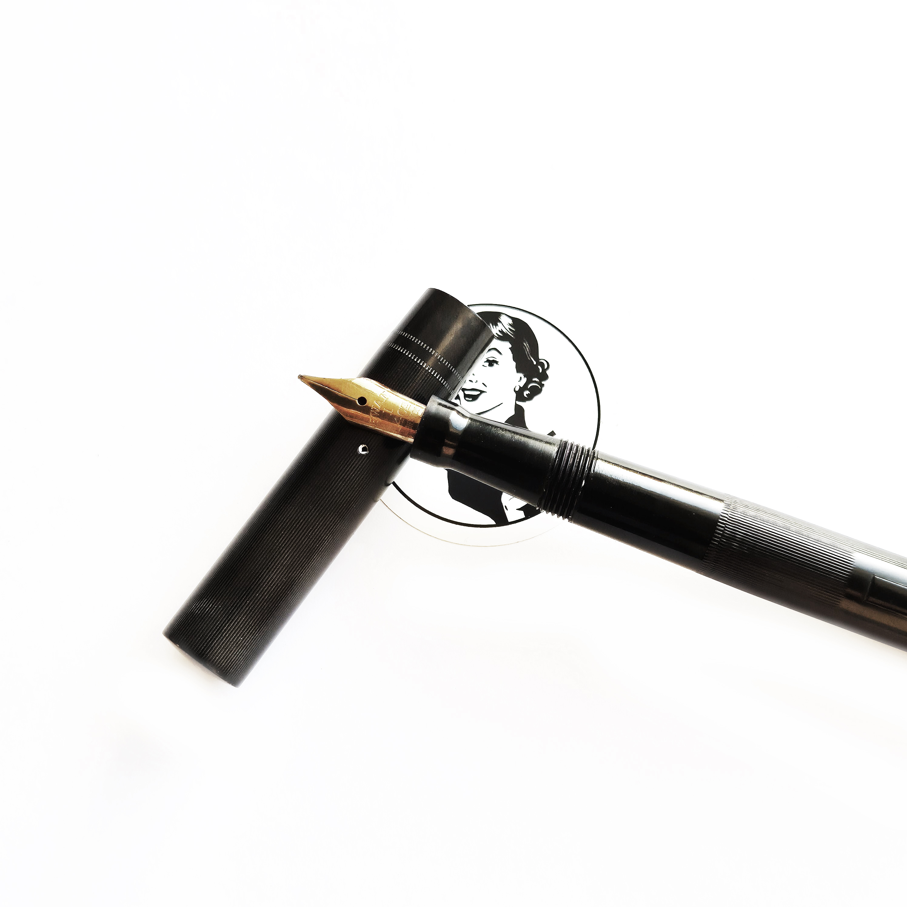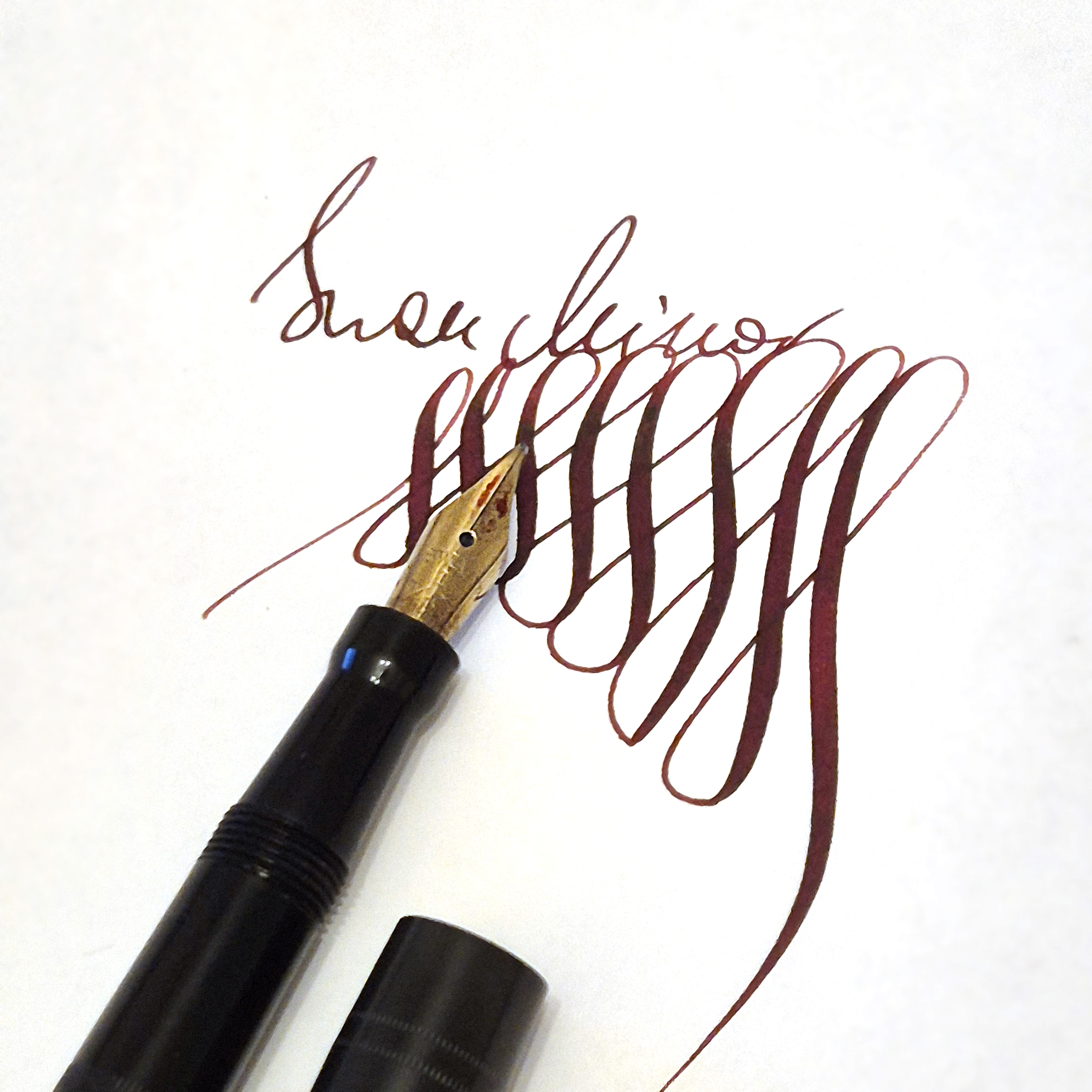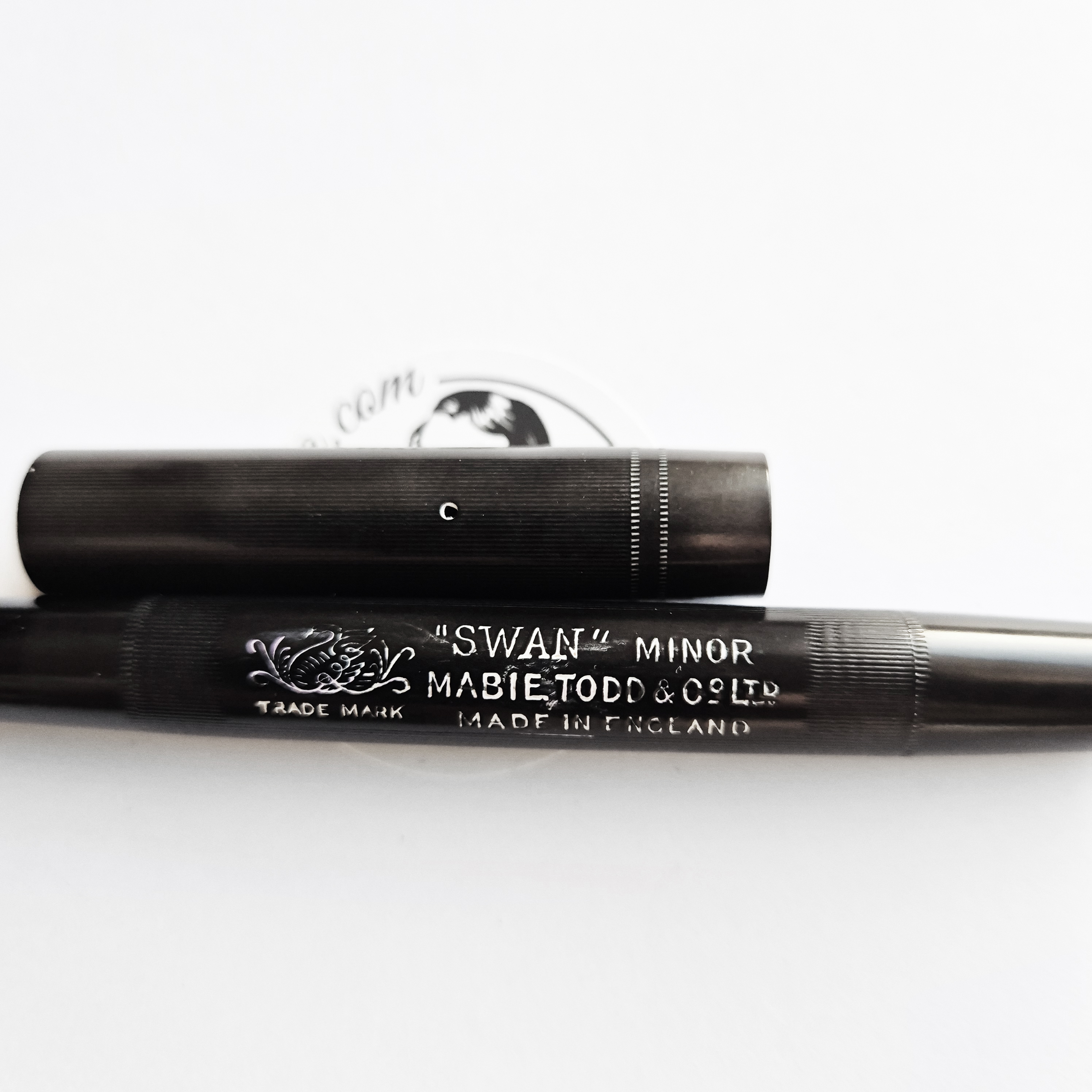 For sale is Swan Minor pen, made in England in the 1920/30’s, made of ebonite and with an ebonite lever. The pen has no cracks or deeper scratches, very good color, perfect imprints. What makes it exceptional is the nib, smooth and with quite a soft flex going from f to 1,7mm. The pen is 13.2cm long when closed.