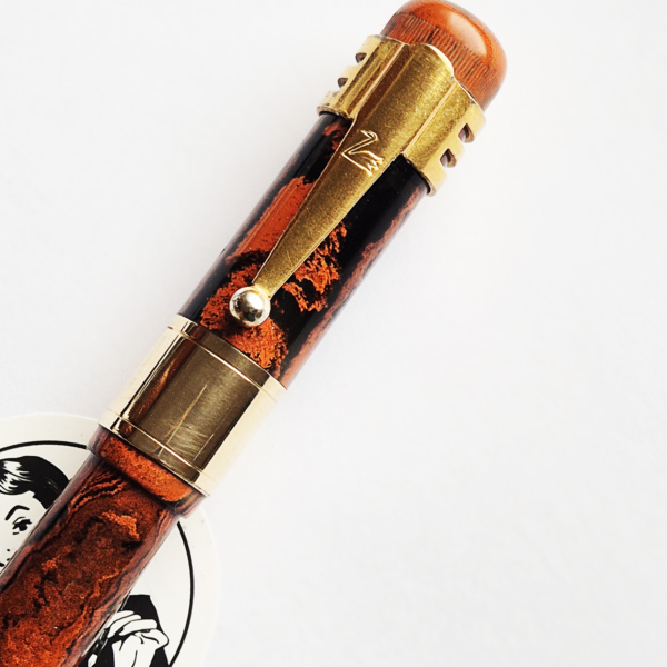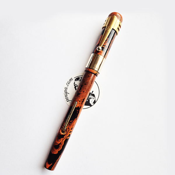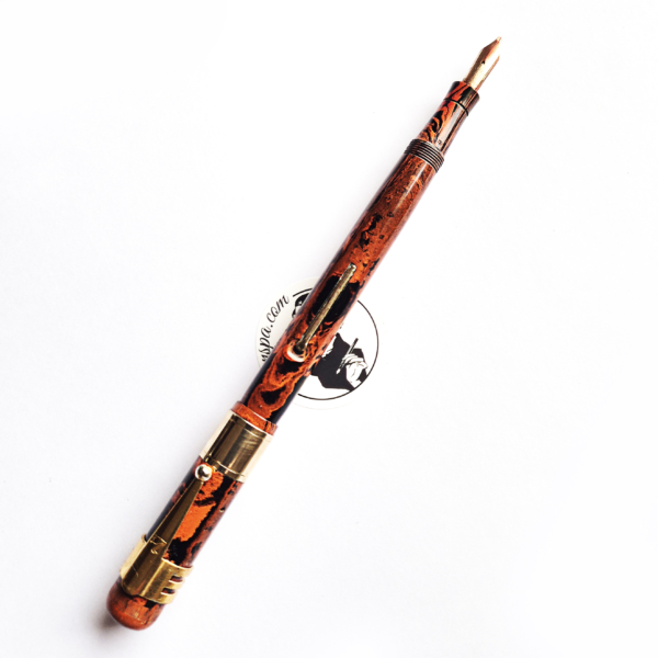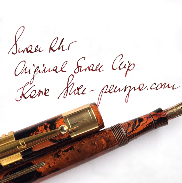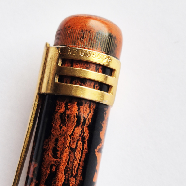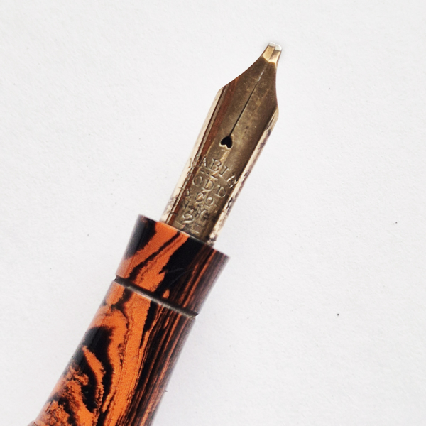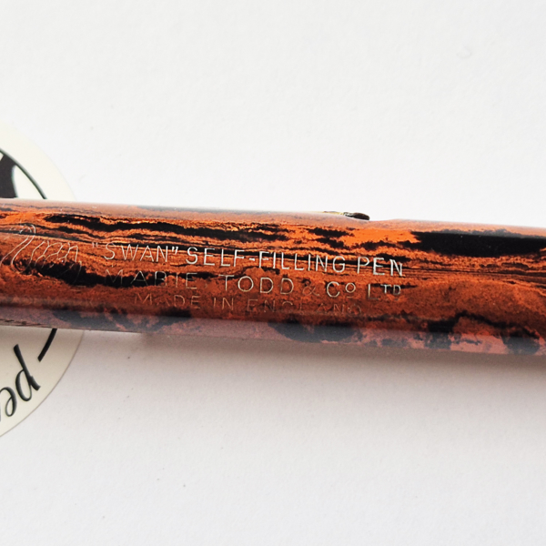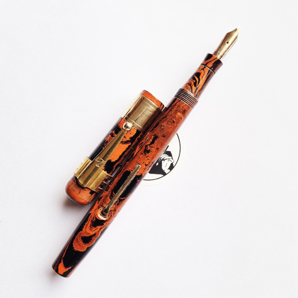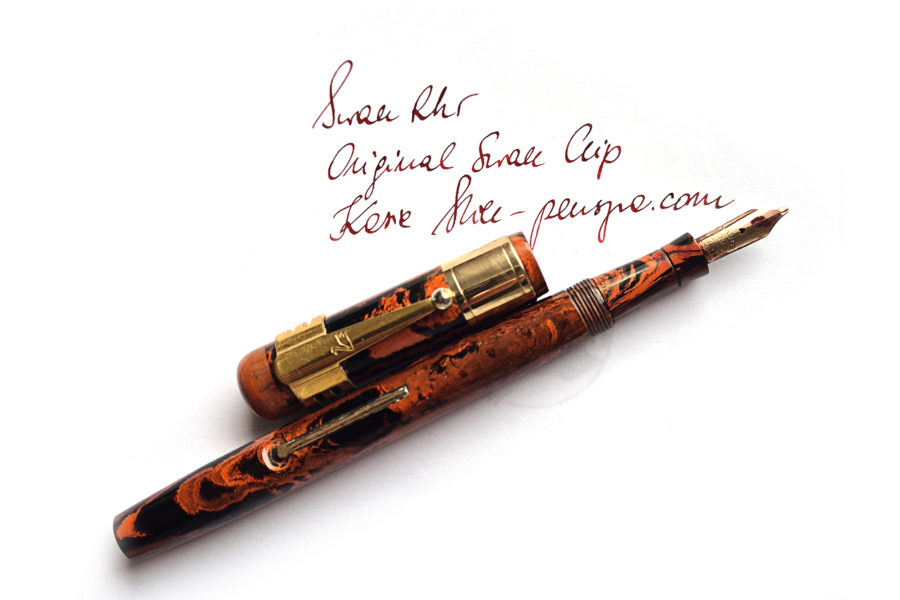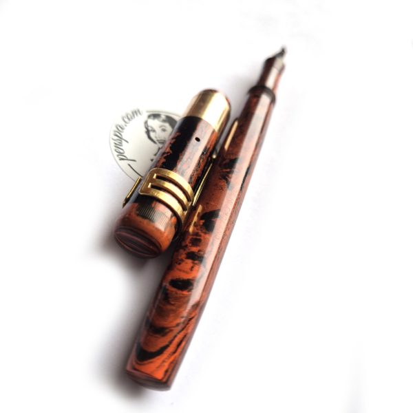 For sale is Swan Self Filler pen made of red hard mottled rubber, lever filler. Made in England in the 1920’s. The pen is equipped with an original Swan accommodation clip. The clip and a wide cap band create a very elegant look. The pen has no cracks or deeper scratches, the color is very nice, perfect imprints. There is some plating loss on the lever. The nib is either you love it or you hate it one. Stub, definitely not buttery smooth – on the contrary, it shows quite a lot of a character. The pen is 14cm long when closed.