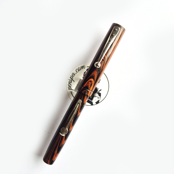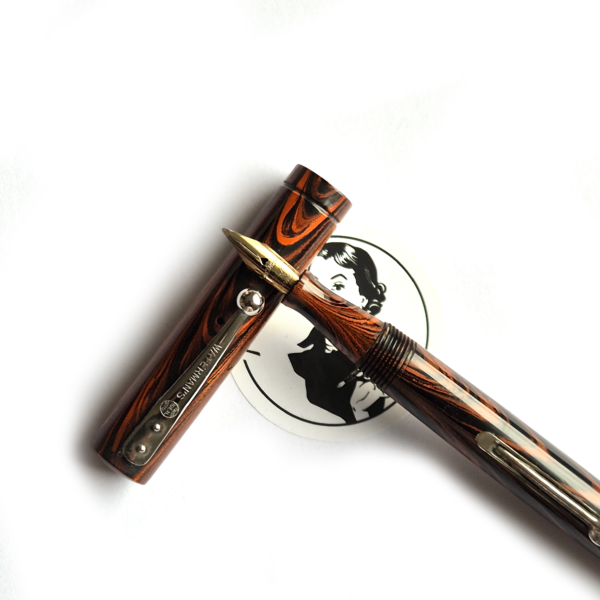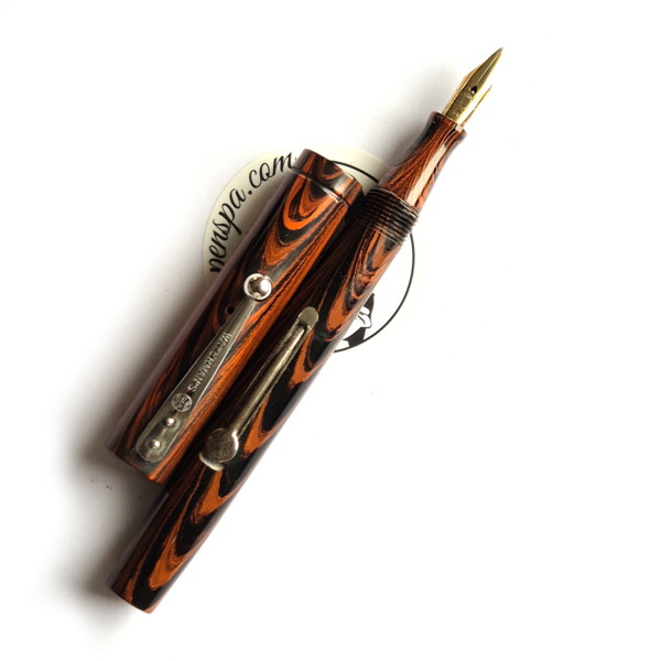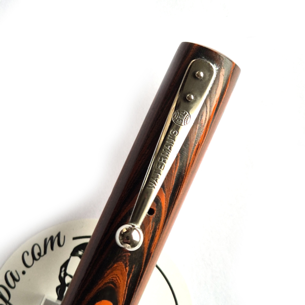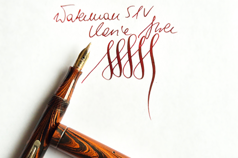 For sale is not very commonly seen Waterman 51v, made in the US in the 1920’s. Red rippled ebonite, lever filler. Chrome trim. Exceptionally good condition with no cracks or scratches. Crisp imprints, very good color. Waterman nr1 nib, tiny but very nice with flex – 1.2mm.